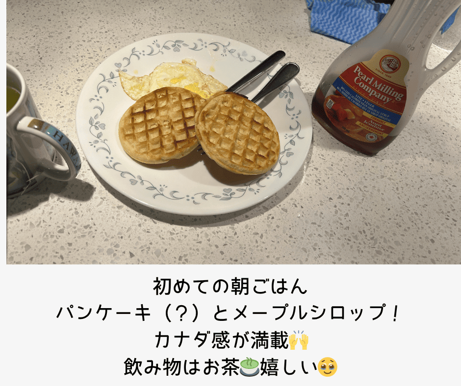 朝ごはんはこちら(パンケーキ・メープルシロップ・目玉焼き・お茶)