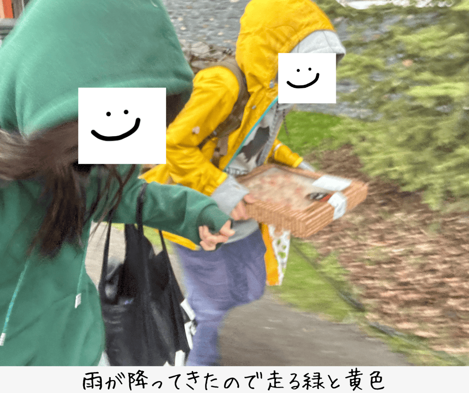 今日は雨が降ってきたので、無料のピザを大事に抱え走る暖色たちをお届けします!