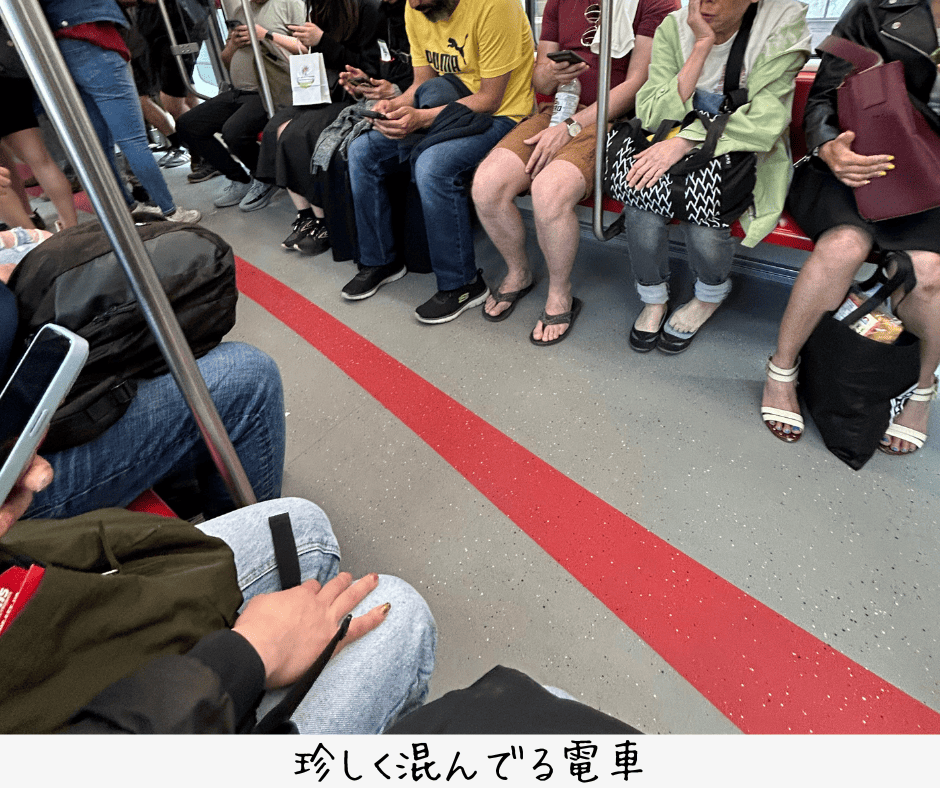 電車は珍しく混んでいます。
