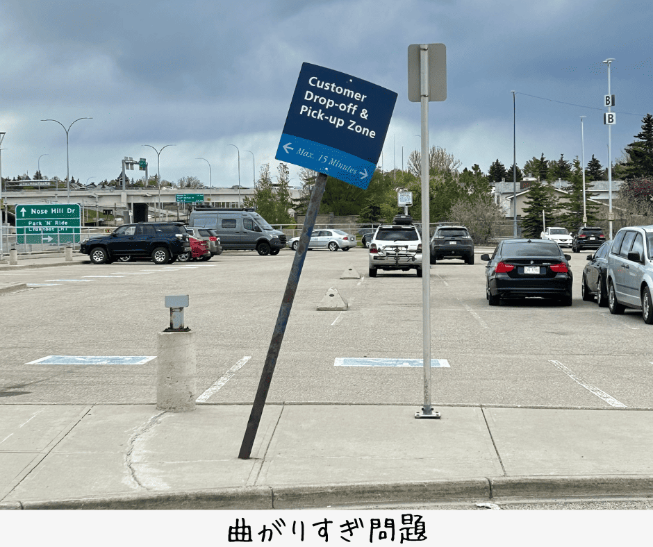 過去一曲がっている看板を発見。